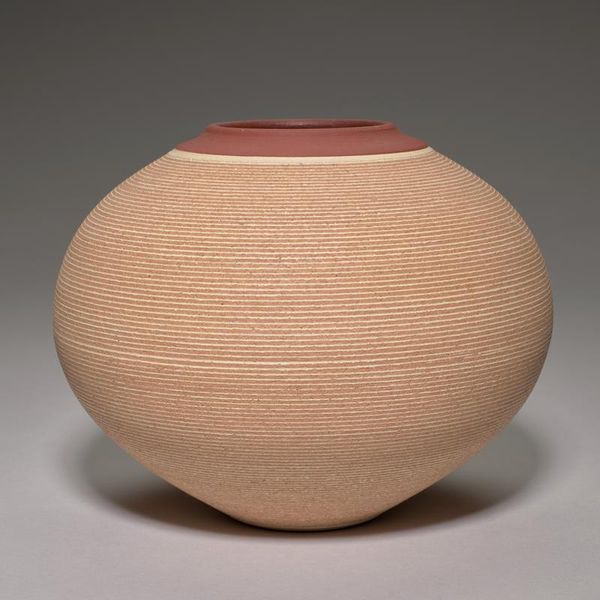 This Jar with Cover was crafted by Robert Sutherland, using what appears to be white clay. Notice the array of parallel lines etched along the surface, a motif that speaks across cultures and epochs. These lines, while seemingly simple, echo patterns found in ancient pottery and textiles, evoking a sense of order and continuity. The verticality might remind us of the ‘horror vacui’—the fear of empty space—that drove artists in ancient times to fill every surface with pattern. Think of the packed compositions on Greek vases, or the intricate details of Islamic art. Here, the lines create a visual rhythm, engaging the eye and suggesting a connection to deeper, perhaps subconscious, desires for structure and containment. The jar itself, as a vessel, carries connotations of holding, protecting, and preserving—emotions deeply tied to our human experience. And so, these elemental shapes continue to resurface, evolve, and take on new meanings in different contexts.