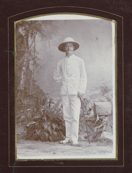Editor: This is a photograph entitled "Jonge vrouw staand bij een boom in Nederlands-Indië," created around 1912 by Onnes Kurkdjian, using an albumen print. The woman’s direct gaze makes me curious about her story. How do you interpret this work? Curator: Considering the social context, it's impossible to ignore that this photograph originates from a period of Dutch colonial rule in Indonesia. Images like these played a significant role in shaping European perceptions and often served as ethnographic records through a colonial lens. Notice how the young woman is presented—the "exotic" backdrop, the detail in her clothing. What assumptions might viewers at the time have made about her, and how do those assumptions relate to the power dynamics of colonialism? Editor: I guess it’s easy to view it through a Western lens, but I wonder what the image meant for people in Indonesia at the time? Curator: Exactly. That’s an important question. Who was this image for? How did the subject, this young woman, participate (or not) in its creation and circulation? Think about the power dynamics inherent in portraiture, especially in a colonial context. Editor: So, it's less about her individual story, and more about the broader socio-political landscape and how she’s being presented in that light? Curator: It's both, wouldn’t you say? Her individual story is obscured *by* the socio-political context, yet it simmers beneath the surface. How might we recover a sense of her agency and perspective? What can the details—her bracelets, her expression, even the angle of the photograph—tell us about her relationship to the photographer, the viewer, and her own community? Editor: That is so interesting! I hadn't thought about photography as such a loaded and political medium back then. Thank you! Curator: Indeed! The political implications in imagery, specifically photographs like this, continue to hold weight, especially within discussions about cultural representation and historical narratives. A close look unveils layers we might have initially overlooked!