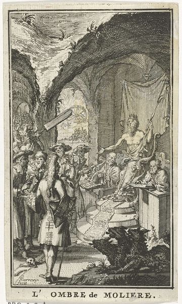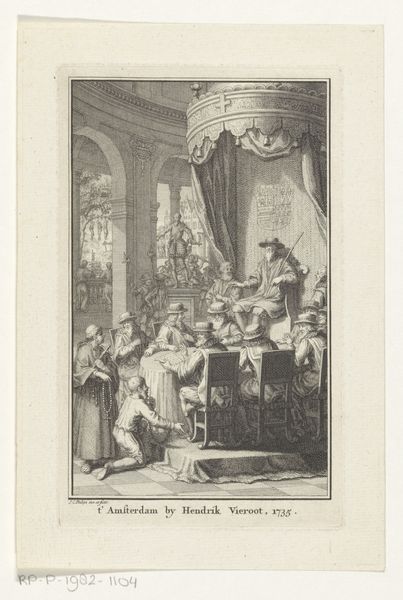 Curator: This delicate pen and ink drawing is a design for the title page of Johannes Janssonius van Waesberge’s “Atlas Contractus,” dating from around 1661-1666, attributed to Zacharias Webber the Younger. What strikes you initially about it? Editor: It feels surprisingly crowded and theatrical for a title page design. So many figures and levels! A grand production for, essentially, book marketing. Curator: Yes, there's an overt Baroque sensibility. Webber creates a visual hierarchy, using allegorical figures alongside recognizable individuals, probably patrons. The contrast of Atlas stoically holding the world with these seemingly wealthy scholars evokes questions around power and knowledge. Who held the power, made it accessible, controlled its creation and consumption. Editor: Seeing the mechanics of map-making laid out is compelling. I'm drawn to the table at the center, where it seems like a female figure, perhaps an allegorical representation of cartography, is actively drawing with a compass. Next to the open map lays what looks like some type of geared navigational tool. What relationship is Webber attempting to construct between raw material and final product by focusing on laboring intellectuals? Curator: That’s exactly what makes Webber's image resonate beyond a simple advertisement. In that period, the Atlas became the symbol of power and human endeavor. Mapping the world equaled ownership. Consider the composition – all these figures gazing toward something, working to harness nature, creating order. How does that vision contrast with other marginalized populations in the period, say, people and lands exploited by colonial forces? Editor: It highlights the division of intellectual labor. This image displays an early kind of globalized production of knowledge. Wealthy Europeans extracting and systematizing information gathered through the exploitation of labor and resources elsewhere. Atlas in this historical reading becomes not just knowledge but specifically the human cost behind European control over it. Curator: And what is it that remains largely unacknowledged even in our time? Art like this design opens a space for us to ask precisely those questions about systems and ethics and what continues to remain excluded or devalued. Editor: Indeed. By showing us the map-makers and the weight of knowledge itself, Webber's composition points to something much bigger: the social relations embedded in the very act of representing the world. It allows us to connect seemingly disparate phenomena—from labor in the workshop to the exercise of colonial power.