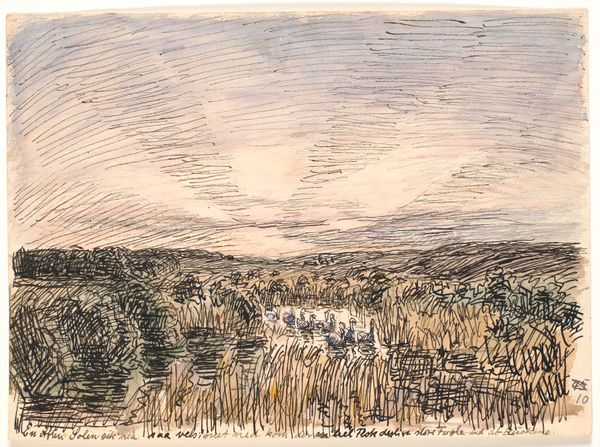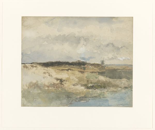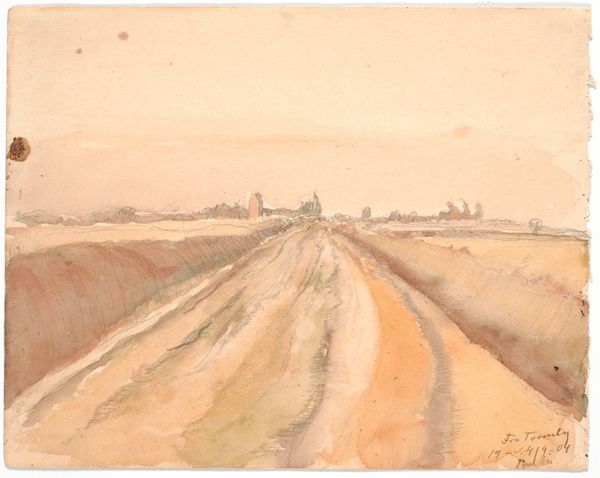 Curator: This watercolor, entitled "Weg door landschap," or "Road through Landscape," is attributed to Wilhelmus Johannes Steenhoff. It's difficult to pinpoint the exact date, as the period listed is quite broad: 1873 to 1932. You can find it here at the Rijksmuseum. Editor: It’s immediately calming, almost melancholic. The soft washes of blue and brown suggest a quiet, overcast day. There’s something very transient about the medium, watercolor, that suits the scene, as though the view might dissipate any moment. Curator: Absolutely. Watercolor as a medium gained prominence with the rise of plein-air painting in the late 19th century, facilitating quick impressions of nature. Steenhoff likely situated himself outdoors, capturing the Dutch landscape directly. Editor: Look at the road itself. It’s not just a path, but a riverbed of memory and suggestion. The blurred edges invite us to project our own journeys and emotional landscapes onto it. The blues interspersed with the browns make the path resemble flowing water almost more than earth. Curator: It's interesting that you pick up on that. Steenhoff, although not a central figure, contributed to the Impressionistic movement in the Netherlands. These artists moved away from traditional landscape depictions towards impressions and the symbolism inherent in a personal rendering of natural surroundings. Editor: Steenhoff captures an ephemeral moment—the effect of light, the quality of air, all conveyed through a loose, almost dreamlike style. Curator: I think we should remember too that as with many works created during the impressionistic movement this watercolor could be politically motivated, even if only implicitly. It highlights the common landscapes away from bustling cities, in the fields of the common worker during this time period of increased industrial output. Editor: Perhaps this invites consideration as to why those every day laborers and places were left behind when paintings began to focus so rigidly on the city. The sky carries a huge weight. The deep blues bearing down contrast with a small area of pale pink or maybe lavender sky above the distant fields. The heaviness seems to press on everything beneath it, landscape, road and traveler alike. Curator: Looking at it through the lens of history, you can certainly feel those tensions. It reminds me how important it is to see art in the context of what's happening in the wider world, as part of our social and political history. Editor: And how deeply embedded in that history and our experience is the resonance of symbols and the cultural memory images evoke.