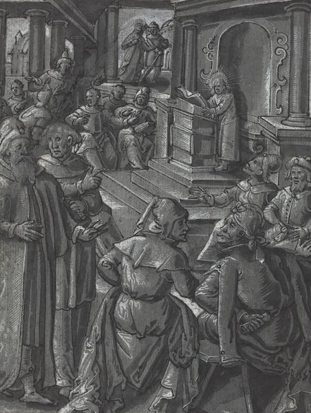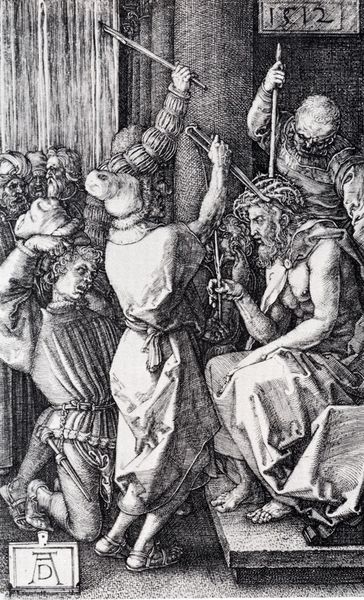 Editor: This is Albrecht Durer's "Christ Before Pilate," a woodcut from 1512. The level of detail in this print is astounding. All of those intricate lines make for a very dramatic scene. What kind of cultural forces were at play here, influencing the artwork? Curator: That's a great observation about the drama, and it’s spot on. Think about the early 16th century in Europe. The printing press was relatively new, enabling wider dissemination of images and ideas. Durer skillfully exploited this. Given that he created multiple prints portraying the Passion, how might these readily available images function in religious life? Editor: They'd probably act like visual sermons, teaching the Passion story to the public! It's interesting to consider Durer not just as an artist, but as someone using new media for mass communication. Curator: Exactly. And consider the Reformation, simmering during this period. Durer, although he never outwardly broke with the Catholic Church, engaged with reformers' ideas. This print, with its emotionally charged depiction of Christ’s suffering, resonates with the reformers’ emphasis on a personal connection with the divine. What visual cues do you see that emphasize Christ's humanity? Editor: I guess, beyond the expressions, is the vulnerability. He seems small and almost overwhelmed by the soldiers and Pilate’s power. It challenges traditional depictions of Christ as this almighty being. Curator: Precisely. By portraying Christ as vulnerable, Durer critiques established power structures. Who does he give more room to in his depiction? Editor: That makes me see this in a different way! Durer used his art to connect with the audience while perhaps questioning the way they’re used to understanding traditional subjects. Thanks, that was eye-opening. Curator: My pleasure! It is by understanding its context we reveal that artwork’s enduring impact.