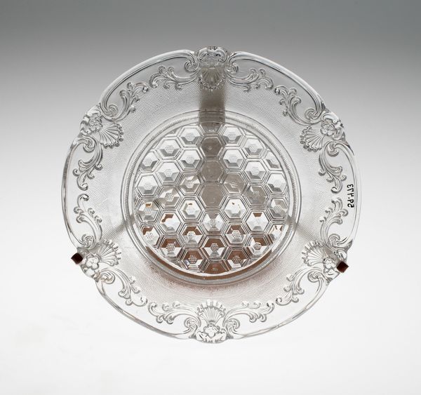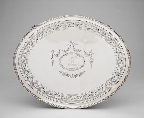 Curator: Here we have a late 18th-century salver crafted by Joseph Richardson Jr., dating circa 1788 to 1790. It's a striking example of American silver work, currently residing here at the Art Institute of Chicago. Editor: Oh, it’s lovely, a real jewel. So pristine and refined! There’s something about the airy fretwork rim that gives it such a light, almost ethereal feel. You could imagine it catching moonbeams. Curator: Yes, the pierced gallery surrounding the edge adds a certain delicacy. It really draws attention to the circular form and the mirrored surface. Silver as a material carries so much social weight— a product of mining, labor, refinement, and ultimately consumption. Editor: Exactly! It whispers stories of candlelight dinners, perhaps precarious stacks of macarons, or clinking glasses of Madeira... what untold histories this shining surface must reflect! Though, admittedly, I immediately picture the silversmith's hands shaping this thing - a highly skilled person. Curator: That's precisely the point. Joseph Richardson Jr. came from a long line of Philadelphia silversmiths, learning the trade from his father. Knowing its crafted locally tells us more about consumption and production practices specific to North America at the time. Editor: Knowing that it comes from this multigenerational trade, you just know it's built with an expectation to last... How interesting, because now, here it is displayed as a prized object! It makes one think about changing perceptions and shifting social significance... Curator: Indeed. And what about the engraved decoration in the center? It's a beautiful monogram surrounded by laurel leaves and topped with a ribbon bow, hinting at a specific family history or perhaps even a celebration of some kind. Editor: Ah yes! You know, looking at the engraving gives me the sense of a kind of 'personal touch' – but at the same time feels impersonal, detached, almost clinical. Maybe that's just because I can't recognize its symbolism... What's so interesting to me is how these forms act as containers, not just for precious substances but, most significantly, culture, too. Curator: Well, this piece speaks volumes about artistic skill and also class and society at that moment. A real insight into our understanding about materiality and the processes involved in transforming something raw into a domestic treasure. Editor: Absolutely. It makes me realize how artworks really transcend time—reflecting on us through centuries and shimmering surfaces.
