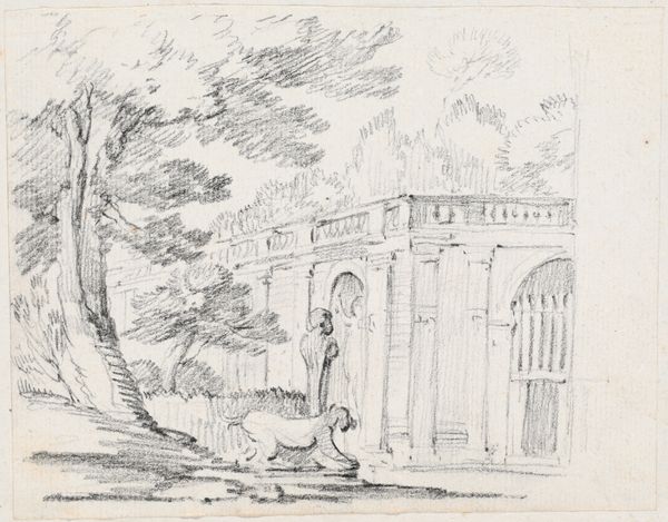 Charles de Anson made this drawing of a couple in 17th-century dress using graphite on paper. The artist has captured a scene with considerable detail and texture. Notice the contrast between the solid architectural forms and the organic shapes of the surrounding trees, all rendered with a delicate touch. Graphite, in its dry, powdery state, allows for controlled gradations of light and shadow. The artist uses hatching and cross-hatching to build up tone and suggest depth, while the smooth paper supports these fine lines. While the scene appears light and carefree, it reflects the social and cultural importance of leisure in the 17th century, for whom such formal gardens were status symbols. The very act of drawing, especially in such a refined manner, speaks to the artist’s skill and the value placed on artistic training. This work reminds us that even seemingly simple materials like graphite and paper can be used to create complex and meaningful images, blurring the lines between fine art and craft.