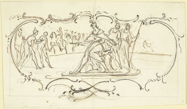 Editor: We're looking at "The Walk in the Garden," a pen and ink drawing by Peter Cornelius, created around 1810-1811. The linear quality of the drawing lends it a rather dreamlike quality. The composition, spanning horizontally, almost seems to present different vignettes rather than a unified scene. What strikes you most about it? Curator: The immediate draw is to the meticulous quality of line, wouldn’t you agree? Note how Cornelius varies the thickness and density to create depth, all within the limitations of ink on paper. Observe the clear delineation between figures and the background architecture. There's a structural rigor underpinning what might seem, at first glance, to be a simple sketch. Editor: I noticed the varied linework, too! But what’s the effect of keeping it so spare, without shading? Curator: Precisely. This directs us to concentrate on the interplay of forms, their spatial relationships. Observe the way the figures are arranged across the pictorial plane – note that you can map relationships and patterns between the figure placement, background and landscape that suggests an underlying symmetrical construction of the image. This ordered disposition and geometry serves as its fundamental aesthetic strategy. How might you interpret this arrangement in formal terms? Editor: So, focusing on the composition more than a narrative? It makes me see how the architecture provides a framework...almost a stage for the figures. I was ready to write it off as "just a sketch". Curator: Exactly. It exemplifies how art can elicit aesthetic meaning by way of material form and pictorial order alone, regardless of iconographic intent. I am inclined to wonder whether there is a hidden meaning to his arrangement. Editor: It's given me a fresh view on how much you can analyze even in the simplest drawings. It reveals structure and underlying intentions through design.