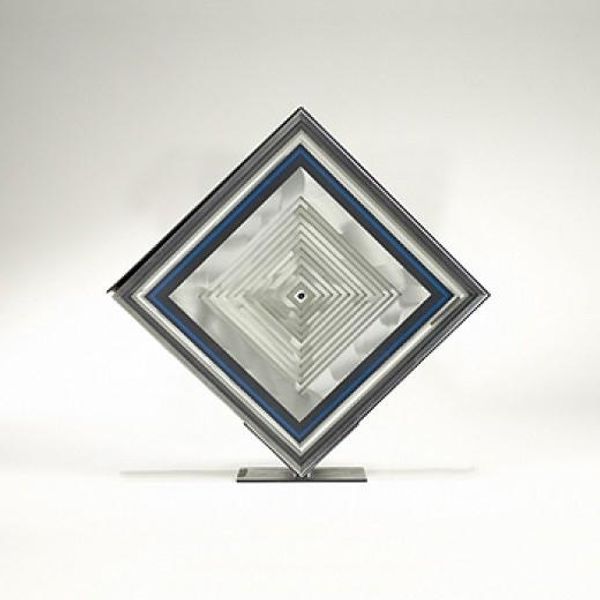 Curator: Here we have Naum Gabo’s “Model for ‘Monument to the Astronauts’”. Editor: My initial feeling is ethereal, almost ghostly. The translucent materials give it such a light, airy quality. Curator: Absolutely. Gabo was very interested in using modern materials like plastic to express new ideas about space and time, especially during the early years of space exploration. It's incredibly small, only 89mm high. Editor: Thinking of its construction, the way Gabo balances this central form within that rigid geometric frame really highlights the tension between the technological promise and the very human element of space travel. Curator: Indeed. It serves as a tribute, using form and material to evoke a sense of aspiration. Editor: It's fascinating how the physical making of this abstract object speaks to such grandiose ideas. Curator: Yes, I agree. Gabo invites us to ponder the infinite through such simple gestures.