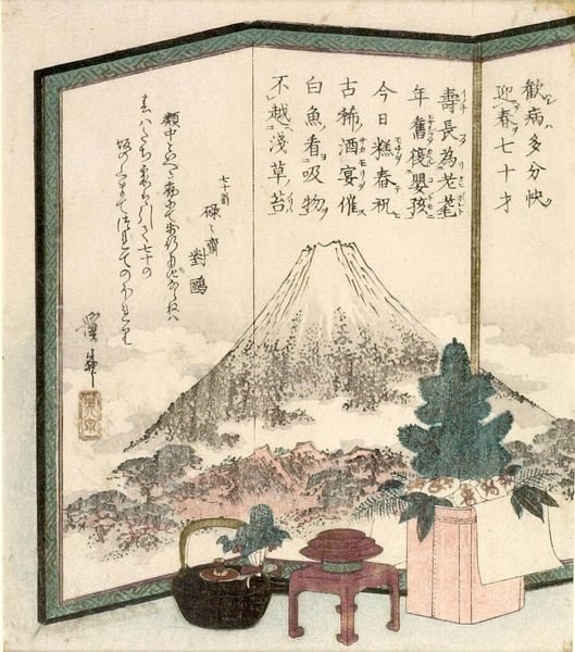 Editor: This is Yashima Gakutei's woodblock print, "Tomo no Atai Yakanushi," part of a series on filial piety. The muted colors give it a sense of quiet reverence. What strikes you most about its composition? Curator: It's a visual poem, isn't it? The kneeling figure arranging offerings, the serene couple observing... I see a delicate balance between duty and devotion. Notice how the geometric patterns in the background contrast with the organic shapes of the pine and the kneeling figure's robe, almost like a visual push and pull. Do you feel that tension? Editor: I do! It’s like the order of society against personal expression. I hadn’t noticed that before. Curator: Art is a mirror, reflecting back what we bring to it.