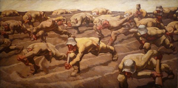 Editor: So, here we have Albin Egger-Lienz's 1916 oil painting, "The Nameless". It looks like a mass of soldiers charging forward, but something about the muted colors and the anonymity of the figures makes it feel really bleak and oppressive. What do you make of it? Curator: Bleak and oppressive, yes. A visual dirge, almost. The ground they traverse is so unforgiving, clawed by trenches, each figure an echo of the other. Notice how Egger-Lienz denies us any heroic focus? They are "The Nameless," swallowed by the machine of war. Doesn't it strike you as a purposeful removal of individuality, as though each soldier is but a faceless cog? Editor: Absolutely! The way they're all hunched over, almost animalistic in their posture. It's dehumanizing. Curator: Dehumanizing, exactly. That muted palette furthers this. Where is the bright promise of glory? All are unified in the earthy brown—like the soil of death, the beginning and the end. Think about it; what colours would you use to paint triumph, against this backdrop of utter, unremitting grey? I challenge that the canvas is, in itself, the subject! Editor: That’s a perspective shift I hadn’t considered. The painting *is* the namelessness! So, less a portrait of war, and more its epitaph. Curator: An elegy, perhaps? What do you carry with you now, stepping away from its grim landscape? Editor: That the true horror of war isn't in the big battles, but in the grinding down of the human spirit. Thanks for showing me that.