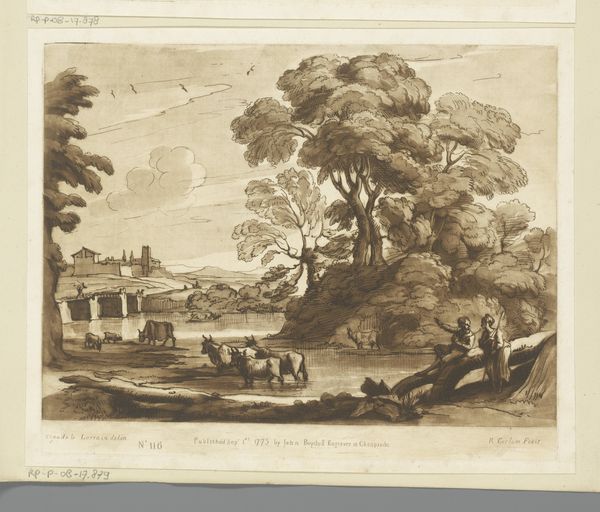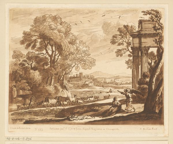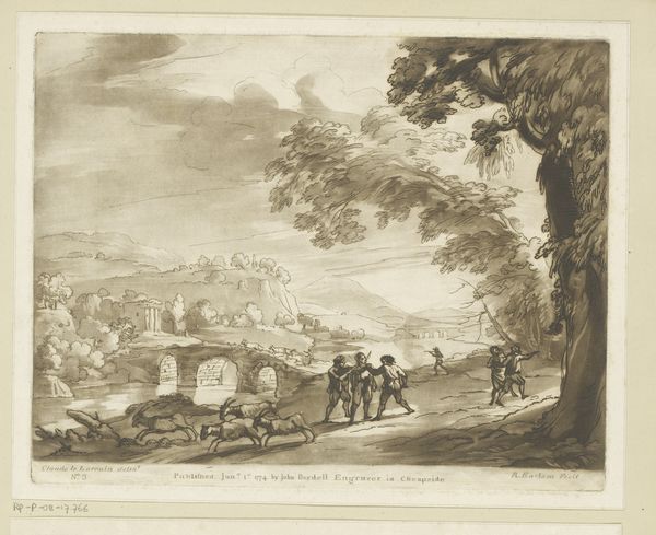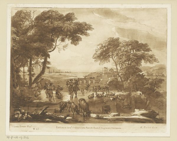 Richard Earlom created this etching of a coastal landscape near a fort in 1773. It invites us to consider the social role of the artist and the cultural values embedded in landscape imagery. The scene reflects the 18th-century fascination with the picturesque, a visual aesthetic that valued both the wildness of nature and the imposition of human order, seen here in the figures and the imposing architecture. The artist included in the foreground, sketching the scene, reflects the growing art market and the artist's rising social status in England. This print was part of a larger series meant to reproduce drawings of the famous painter Claude Lorrain. This reveals much about the institutional history of art, and how it borrows from and reinterprets the past. To fully understand the image, we might look into the publishing history of Boydell, the publisher, or the influence of the Royal Academy on artistic taste. Ultimately, this image reminds us that art is never created in a vacuum, but is shaped by the social and economic conditions of its time.