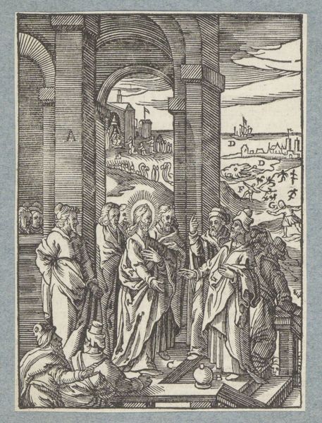 Curator: The mood feels somber, doesn't it? The way the lines are etched—it's not exactly joyful. Like they're telling a secret. Editor: We're looking at "Heilig Maagschap," or "The Holy Kinship," an engraving by Christoffel van Sichem II, likely completed before 1646. This print, part of the Rijksmuseum's collection, meticulously details a gathering of biblical figures through a style echoing the Northern Renaissance. Curator: "Kinship," huh? I can’t help feeling they all seem a bit... stiff. Look at those folks gathered 'round, like waiting for something big to drop. Not exactly my family gatherings. Editor: Perhaps that stillness is part of the point? Sichem's piece really demonstrates the formal characteristics of Northern Renaissance art, that intense focus on detail. The architectural setting—the play of lines in the background versus the figures. The precise detailing certainly dictates much about how we interpret it. Curator: True, that backdrop—it’s oddly captivating. But something feels missing. Like a touch of humanity or… I don't know, a wink? Though that dog at the bottom does provide a note of levity, thank goodness! Editor: Notice the semiotic play though – that dog, indeed! Is it not a symbol of fidelity, underlining the devotion within this familial group? Everything down to that overturned bowl and unattended object at the lower right are included for purposeful meaning and further reading into familial virtue and values. Curator: Okay, I see your point, trying to find balance is the message perhaps? It’s like this super proper, meticulously organized family photo from forever ago. Though the details, like the dog and bowl, really keep me engaged— like, there's an invitation to find the quirky bits even within these stern characters. It invites an odd sense of… possibility. Editor: The material reality, the deliberate and controlled engravings, presents the depth within. We uncover not only the technical capabilities of Sichem but, I think, a certain depth of engagement with that period and art tradition. Curator: Absolutely, the way all those folks came together really puts everything into perspective and makes you look inward on that which connects us all. And me— I’ll always take any reminder to invite a dog or two along for the ride.