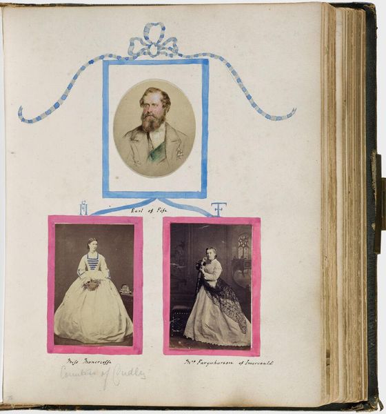 Editor: This is an untitled photographic work by Mary Georgiana Caroline Cecil Filmer, featuring four portraits. I’m struck by the contrast between the Colonel and the ladies, in terms of setting and attire. What compositional elements stand out to you? Curator: Notice the framing within the framing. Each photograph is itself a rectangle, carefully positioned on the larger page. Observe, too, the tonal range: the subtle gradations of light and shadow that define form. Editor: So, it’s less about the subjects themselves and more about how they’re presented? Curator: Precisely. The formality of the poses, the controlled lighting, even the handwritten captions, all contribute to a carefully constructed visual narrative. Consider how the arrangement guides the eye. Editor: That’s a great point. I see the visual relationships more clearly now. Curator: Indeed, exploring the formal properties reveals a deeper understanding of the work's intrinsic qualities.