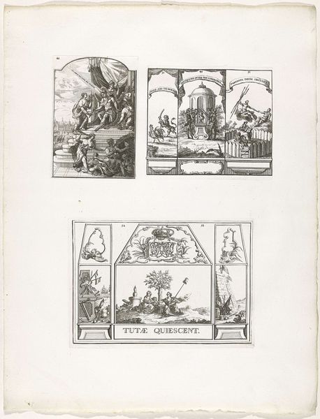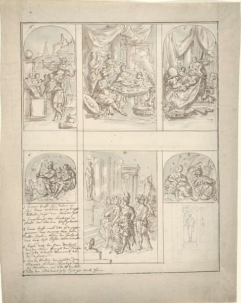 Curator: What grabs me about this particular engraving, dating from around 1790-1796, and created by Cornelis Brouwer, currently residing here at the Rijksmuseum, is the narrative condensation it represents. Entitled "Onversneden vel met vijf voorstellingen waarvan één van een historische gebeurtenis uit 1783," it showcases five separate scenes on a single uncut sheet. Editor: Well, first off, it gives me that lovely, slightly frantic feeling of peering into someone else’s sketchbook. All these little worlds crammed onto one page—almost voyeuristic, don’t you think? Curator: Precisely. Each vignette carries its own symbolic weight. For example, consider the historical event depicted – the specific historical event referenced in the title. How does its inclusion alter your sense of the adjacent genre scenes, those depictions of intimate, everyday moments? How does that contrast reveal aspects of society or individual experience? Editor: It definitely elevates the everyday, like the soap opera playing out in one of the interior scenes suddenly takes on the gravity of state affairs. Or conversely, it miniaturizes grand events, fitting them onto the same mental canvas as a lovers' quarrel under a tree. Curator: The Neoclassical style is apparent in the figures' poses and the architectural elements. Note how it imbues the historical scene, probably from 1783 as stated in the title, with an aura of order and rationality – values prized during that era. And notice the more fluid, personal lines used elsewhere? How might this suggest shifting priorities or attitudes during this transitional moment in European history? Editor: Right! The light pencil work gives it an approachable feel, almost democratic, contrasting those very stiff formal compositions. Almost like he's saying, "History is happening here, too, in these intimate corners." I love how it manages to feel both grand and personal. Curator: Ultimately, these collected scenes serve to present several faces of contemporaneous life. We could say Brouwer captured, in microcosm, the grand stage and personal drama that constituted the experience of the late 18th century. Editor: A mental scrapbook! Brouwer’s personal take on history… that’s something I can really connect with.
