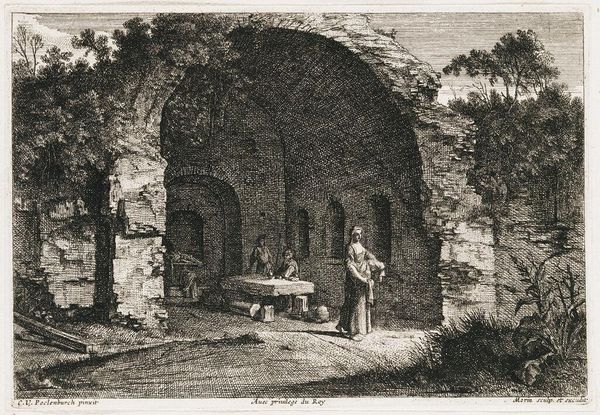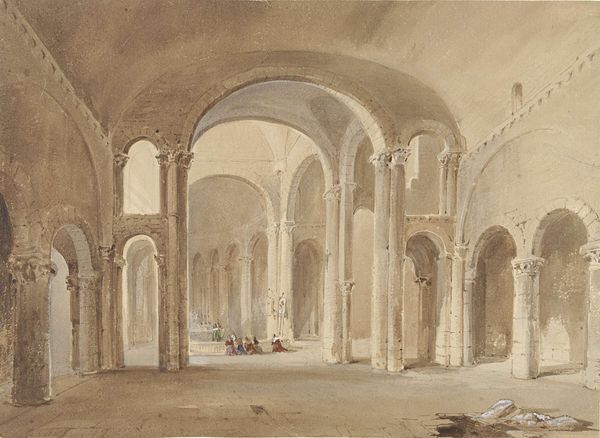 Curator: Looking at this work, "Crypt of Kirkstall Abbey (after J.M.W. Turner)" by David Cox, I’m struck by the way Cox engages with architectural ruins. The layers of history speak to the narratives of displacement and how spaces transform and are reclaimed over time. Editor: Immediately, what grabs me is the interplay of light and shadow. There's a deliberate use of contrast, especially in the arches and columns. It guides the eye, creates a beautiful structural harmony. Curator: It's not just structural; the choice to depict the Abbey as a shelter for livestock prompts consideration of power dynamics – the sacred repurposed. How does a holy space reconcile with providing sanctuary to animals deemed ‘less than?’ Editor: Precisely! But observe the formal elements. The columns, how they recede and establish depth. The repetitive arch motif—see how they serve as echoing chambers for light? Notice the colour washes, layering and subtle gradations? Curator: Yes, and this also can raise questions regarding access, particularly in relation to class. These are no longer spaces exclusively for religious elites. This invites us to consider the economic realities that render such spaces accessible, or inaccessible, to different social groups. Editor: I can't disagree about your observations about contemporary economic conditions, yet, consider this as simply about form. The textured application of watercolor suggests decay. But even that decay contributes to the overall pictorial texture. There's beauty in the fragmentation, you see. Curator: Absolutely. But isn't it more compelling when that aesthetic beauty intertwines with questions of what is valued, who has access, and what transformations reveal about shifting social priorities? These ruins prompt dialogues. Editor: I acknowledge that there is more that this artwork may offer, however I still keep returning to the structural language: the columns speaking to time and how its erosions add more complexity to these shapes. Curator: Yes, there is more than can be offered from both of our voices.