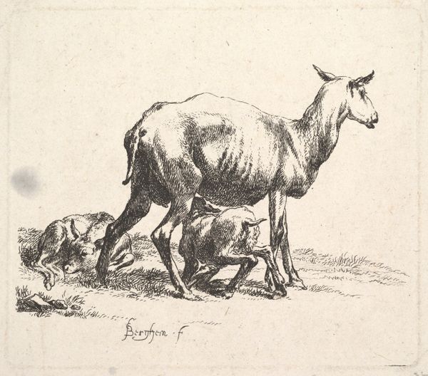 Editor: Here we have Eugène Verboeckhoven's "Stier en liggende koe," an etching created sometime between 1808 and 1881. It's a fairly simple composition of two cows in a field, but I find something peaceful and almost monumental about the bull's stance. What do you see in this piece, particularly given the period it was made? Curator: What I see is a representation of the romanticized view of agrarian life popular during the rise of industrialization. Verboeckhoven’s detailed rendering of these animals almost elevates them. Consider the socio-political context. As cities grew and labor became increasingly alienated, idyllic pastoral scenes became a powerful symbol of a lost connection to nature, a sort of visual pushback against the changing social landscape. Do you see any element of realism versus idealization here? Editor: I see what you mean. While the detail is realistic, there’s a certain idealized stillness. They’re not working; they're just existing peacefully. It's interesting how this 'realism' is itself a constructed viewpoint. Curator: Exactly. Think about who this imagery served. Often, these depictions reinforced class structures, portraying a serene rural life that masked the realities of labor and land ownership. Furthermore, depictions like these often omit any presence of farm workers themselves, effectively erasing them from the narrative. Do you think this image contributes to such narratives? Editor: I suppose it does. It lacks the human element entirely, presenting the animals in isolation. That adds a layer to its romantic, but potentially problematic, viewpoint. Curator: Precisely. By examining art within these power dynamics, we reveal its ability to both reflect and shape cultural ideologies. This exploration really enriches our understanding of Romanticism and Realism, beyond simple stylistic labels. Editor: I'll definitely look at pastoral art with a more critical eye going forward! Thanks!