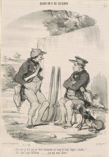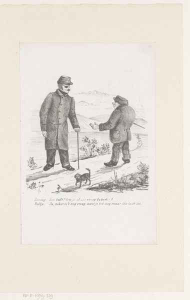 Curator: I find this drawing by Jeremias Adriaan Adolf Schill, titled “Two Men by an Abyss,” to be a captivating snapshot of a bygone era. Dating from 1864-1902 and crafted using pen and ink, it presents us with a quiet but intense moment. Editor: My first impression is that it feels unsettling. There's a stillness to the composition that hints at underlying tension. Is it the sketchy linework that makes it feel precarious, like any moment might send those figures tumbling over? Curator: It’s fascinating how such a seemingly simple genre painting, in the vein of a portrait even, can evoke such unease. Think about the social climate of the time – anxieties about industrialization and humanity’s place in nature were definitely swirling around. Perhaps this scene acts as a metaphor for such instability? Editor: Absolutely. I see the figures as archetypes caught between worlds, especially the man with his arms raised. It evokes a performative act—a constructed display of alarm or vulnerability that seems oddly theatrical when examined. I wonder if Schill intended a subtle critique of masculinity and societal expectations. Curator: An interesting perspective. These men were more than likely engaging in a common form of leisure in this period, walking through natural landscapes, which often contained hidden industrial spaces or encroached on native lands. Such class display cannot be easily disregarded, especially knowing this work is now a part of the collection here at the Rijksmuseum. Editor: And seeing it here shapes our understanding today! It challenges the romanticized narratives we tend to construct about nature and human interactions. It begs us to think critically about those are represented and how, and at what cost to others or the environment it has come to be. Curator: Indeed, its ability to raise such profound questions, so succinctly, makes "Two Men by an Abyss" much more than a simple drawing. It encourages us to reconsider art’s potential in examining class display and society at large. Editor: Yes. I’m taking away with me a much greater sense of depth than I initially anticipated with these characters frozen on the page, facing this existential drop.
