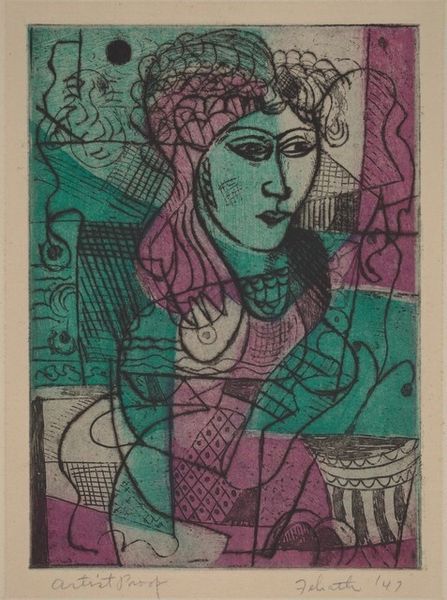 Leon Goldin created "Two Drinkers" using lithography on paper. The composition immediately strikes us with its overlapping forms and the cool blues and browns that dominate the palette. The red hat and stripes create focal points against the more muted tones. The texture, achieved through lithography, gives the image a tactile quality, almost like a drawing. Goldin uses the visual language of Cubism to destabilize our perception. The faces are fractured and reassembled, challenging traditional portraiture. This fragmentation mirrors the psychological state of the drinkers, perhaps reflecting on the disorienting effects of alcohol or the fractured nature of human connection. Consider the strategic use of line and color to carve out space and form. The superimposition of faces suggests a merging of identities, a shared experience that transcends individual boundaries. This invites us to reflect on how shared experiences can blur the lines between self and other.
