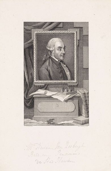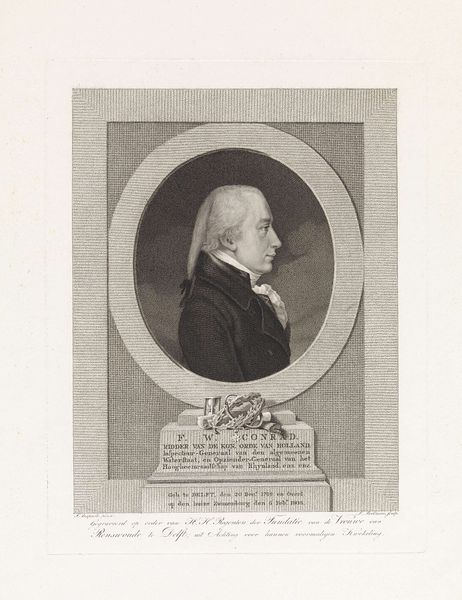 Curator: This engraving from 1797 is entitled "Portret van geestelijke Benedetto Fenaja" or "Portrait of the cleric Benedetto Fenaja", and it’s by Carlo Lasinio. I find its starkness immediately compelling. Editor: The image certainly evokes a certain austerity. It's all lines and carefully controlled tonal gradations, isn't it? Look at how Lasinio has rendered Fenaja’s habit—the meticulous cross-hatching that suggests a heavy woven material, quite likely wool. And how those minute details contribute to the portrait’s overall gravitas and believability as the likeness of a historical figure, with particular relevance for this cleric. Curator: Indeed. Let's examine the symbolism embedded within. The circular frame surrounding the portrait carries the inscription "SERMO IERIUS POTESTATE Plenus EST Ecclcs.," essentially conveying that this is a person who is invested with sacred knowledge and influence of his status. It makes me consider, how does such a representation become a symbol for not just an individual, but the embodiment of a cultural institution, maybe even values, or authority? Editor: Good point, this engraving likely was produced for mass dissemination. How efficiently could prints like these, using relatively accessible techniques and materials, manufacture and proliferate ideals and representations of faith? I wonder, too, how many of these engravings would've been circulated, in what format they were disseminated—loose leaf, bound? Also, who owned them, who was permitted or privileged enough to hold these images? The details would undoubtedly cast the object’s value into light and also influence how people respond to them and shape society. Curator: The image seems rather formal given its apparent method of distribution. Considering the symbols and portrait in their entirety, there appears to be no visual flamboyance associated with Fenaja as an icon. A portrait intended not just for memory, but as a sort of spiritual anchor in a period of societal flux. What this work visualizes, therefore, is faith’s enduring claim in times when institutions confront immense change. Editor: Exactly, understanding it not as a singular work, but as a point of confluence in a nexus of making and dissemination really does give you an understanding of how religious authority made the invisible visible.