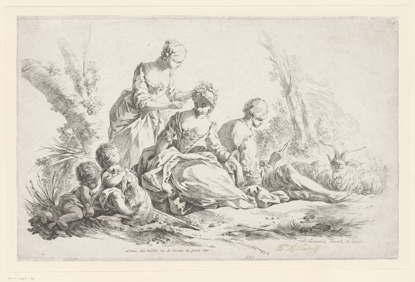 Giuseppe Canale made this print, "The Judgement of Paris(?)," sometime in the late 18th century. It’s an etching, meaning that the image began as lines scratched into a wax ground on a metal plate, which was then bathed in acid. This eats away the exposed metal, allowing for the plate to hold ink, and then be printed. Look closely, and you'll see how the artist has built up tone through carefully placed parallel lines. This was a very physical process, requiring immense skill and patience to achieve the light and airy quality. This print simulates the effect of a drawing, yet multiplies its imagery through mechanical means. Prints like this were essential to the circulation of images and ideas in the 1700s. Etching was a skilled trade, but it also served the world of commerce. This image may reference classical antiquity, but it was made in a world increasingly driven by industrial production and consumption.