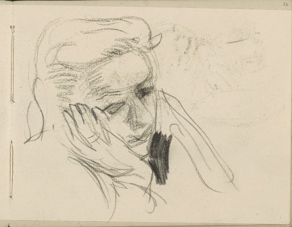 Curator: Here we have "Vrouwenhoofd, de hand op het hoofd" – or "Head of a Woman, Hand on Head" – a compelling pencil drawing crafted sometime between 1848 and 1927, attributed to August Allebé. It's currently part of the Rijksmuseum's collection. Editor: My immediate impression is one of quiet introspection. There’s a vulnerability in her gaze, as if we've caught her in a moment of profound thought. The sketchy quality of the pencil lines only adds to that feeling of transience, like a fleeting idea captured on paper. Curator: Absolutely, the gestural lines give the impression of immediacy, but look closely at how the artist renders the fall of light across her face and the delicate modeling of the hand. These elements reveal a foundation in academic art principles. Editor: I see that, and it’s quite effective. The diagonal lines of the torso, how they're cut off at the base...It feels incomplete yet potent, more of an emotional study than a polished portrait. I am wondering if this is just an artistic representation or the subject has something more profound and her emotional situation is clearly shown. Curator: The positioning of the hand, the slight tilt of the head - it could suggest various internal states: contemplation, perhaps worry, or even a touch of weariness. Allebé leaves it open to interpretation. It reminds me of the sort of raw expressiveness you see in the early sketches of Klimt. Editor: True! It also makes me think about the power of suggestion. With just a few well-placed lines, Allebé conveys so much about the woman's inner life. There’s a certain intimacy created, almost as if you’re peeking into her private world. Curator: I appreciate how this piece offers a quiet contrast to many of the grand historical paintings in the Rijksmuseum. It's a reminder that profound artistic expression can be found in the most subtle of forms. Editor: Yes, it invites us to pause and reflect, not just on the woman depicted, but on the shared human experience of contemplation and emotion.