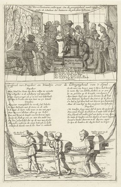 This print, depicting Cornelis de Witt's capture in 1672, was created by an anonymous artist using etching, a printmaking technique reliant on acid to corrode the unprotected parts of a metal surface to create a design. The material qualities of the metal plate deeply influence the aesthetic, the incised lines holding ink to be transferred onto paper. The linear precision made possible by the etching needle allows for a remarkable level of detail, vital for conveying the drama of the scene – De Witt surrounded by an angry mob, his fate hanging in the balance. Prints like these played a crucial role in shaping public opinion during times of political upheaval. Produced in multiples, they were a relatively accessible medium, disseminating images and ideas widely. The work involved in their production, from the skilled labor of the etcher to the distribution networks that circulated them, highlights the intersection of art, politics, and the burgeoning print culture of the 17th century. It reminds us that art is never separate from the social and economic conditions in which it is made.