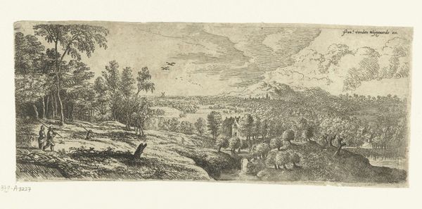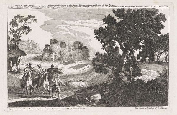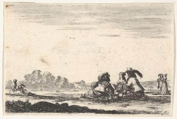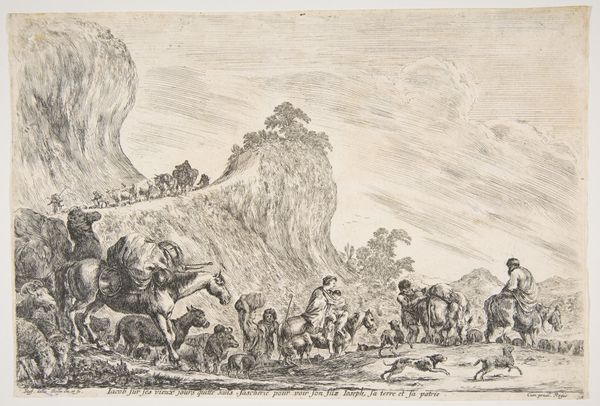 Curator: Ah, here we have "Herder met geiten en schapen bij een rivier," or "Shepherd with Goats and Sheep by a River." It’s an etching, created sometime between 1610 and 1650, a testament to Dutch Golden Age landscapes and currently residing here at the Rijksmuseum. Editor: It has a striking melancholic simplicity to it, wouldn’t you say? The figures are minimal, almost silhouetted, emphasizing a quiet observation of daily pastoral life, likely by someone from that world. Curator: The river is undoubtedly a key compositional element. The figures are placed beside the water to create a sense of serenity. In Christian art rivers often function as symbols of purity and life itself. Does it evoke anything in you? Editor: Well, given that this print circulated – perhaps widely – we might think of how such imagery normalized agricultural life for increasingly urban consumers. Did access to printed material impact our sense of work as physical labor and class? Curator: Perhaps! One could explore that angle. Etchings themselves are such democratic tools; the relative ease and reproducibility of the medium allowed for the dissemination of artistic ideas far beyond the elite circles who commissioned oil paintings. And yet, an element of the maker is present in every individual print. Editor: I am interested in this concept of maker presence in printed works. It challenges this idea of artistic genius. Can we explore the chemical processes involved in this creation? Are there social hierarchies of labour embedded even here, within this reproducible format? Curator: That's a crucial observation; while printmaking fostered wider distribution, the etching process required skilled artisans to create the plates. Those anonymous hands shaped these artworks just as significantly as the artist's design did. Perhaps even the ink types or the paper texture point us to networks of global trade and the consumption of this imagery. Editor: Exactly! So, looking again, I'm less taken by that supposed quiet observation and more curious about the distribution, labour conditions, and the paper’s physical journey that enabled its survival. Curator: It's fascinating to consider it in terms of circulation and labor. Editor: Yes. It compels us to see beyond the picturesque, recognizing how the image is tethered to the socio-economic world from which it emerged.