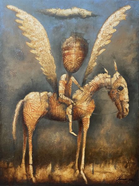 Editor: This is "Le gardien," or "The Guardian," an oil painting from 2014 by Carlos Sablón. I’m immediately struck by the improbable composition – a knight in shining armor riding a rooster, which balances precariously on a blue orb! What do you see in this piece? Curator: Intriguing. Immediately, the formal elements present a compelling juxtaposition. The artist establishes a tension between realism and surrealism, using meticulous brushwork to render believable textures in the figures, while simultaneously placing them in an impossible scenario. Observe the intricate details in the knight’s armor juxtaposed to the rooster's vibrant, almost chaotic plumage, versus the somewhat bland representation of the landscape. Editor: So the contrast is intentional, drawing our eye to those textures and… that impossible balancing act? Curator: Precisely. The artist’s intention might not necessarily be clear. Does the formal interplay suggests the fragility of the earthly existence this guardian seems sworn to protect? Consider also the tension created through color - the subdued palette of the background, emphasizing that red, dominant focal point. Why that egg, why that tension? Editor: It makes me reconsider how those elements all create a sense of precariousness, a disruption of expectations with serious underpinnings. Curator: Exactly. Formal analysis allows us to approach deeper symbolic layers while focusing strictly on what is visible on the surface. Editor: I’ll never look at a rooster the same way. Analyzing its components like that really helped to unravel the visual argument, even without a definitive answer.