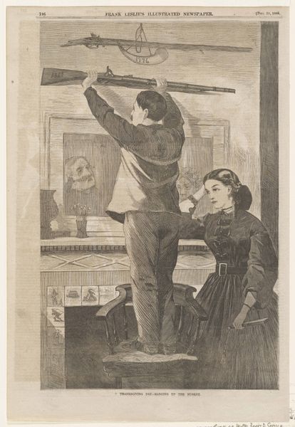 Editor: This is "The Family Record" by Winslow Homer, an etching from 1875 published in *Harper’s Bazar*. I find it quite touching, the way the parents are documenting their family history while the baby looks on. What strikes you most about this work? Curator: The power here lies in how seemingly simple domestic scenes become powerful vehicles for cultural memory. Consider the image of the father writing – what does that symbolize to you? Editor: Perhaps the establishment of lineage, tradition? Curator: Precisely. The act of recording, especially in that era, often signifies legacy. But observe the portrait hanging in the background; who do you think it represents, and how does it add to the overall meaning? Editor: Maybe a deceased relative? It adds a layer of connection to the past, a continuation. Curator: Exactly. The artist evokes an understanding of family not just as it exists in that room, but extending backward and implicitly, forward. Think about the composition - how are the three figures arranged? The father seated, mother looking on and the baby confined. Does that arrangement give us more context? Editor: Yes! There is a definite hierarchy. Curator: Do you think Homer critiques or simply depicts it? Editor: That's an interesting question. I lean toward depict, as the scene feels quite genuine. Thank you for shedding light on the family’s symbolic arrangement! Curator: My pleasure. Images like this remind us that art often carries subtle cultural narratives that connect us to our shared history.