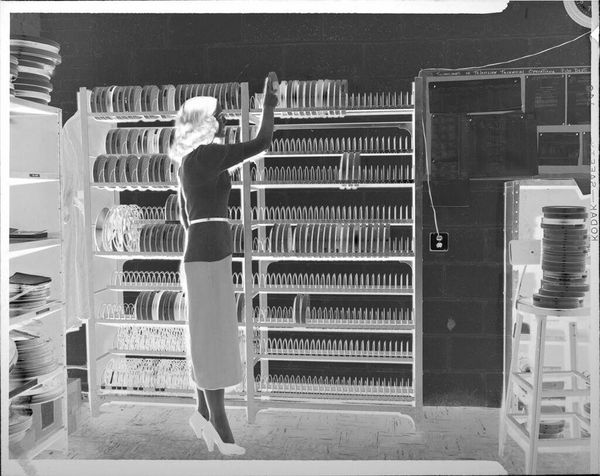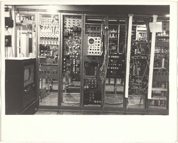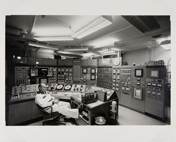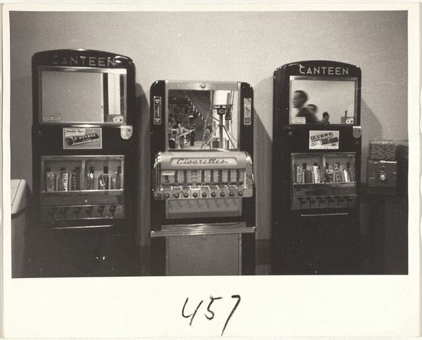 Curator: This image, an untitled photograph by Peter James Studio, depicts shoppers in an appliance showroom. It measures about 4 by 5 inches. My first thought is how stark it is, the high contrast almost burns into the eye. Editor: And it captures a fascinating cultural moment, doesn't it? Look at these consumers surrounded by gleaming, almost monolithic refrigerators and stoves. Curator: These appliances represent more than mere functionality. They symbolize a post-war ideal of modernity and domesticity, promising ease and efficiency. Editor: Indeed. The photograph acts as a time capsule. The styling of the appliances reflects a specific era, revealing how design shapes our aspirations. Curator: It's the interplay of light and shadow that holds my attention. The light seems to drain all the color. Editor: Perhaps the artist uses it to point out the homogenization of consumer culture. Each appliance, while promising individuality, seems to echo the others. Curator: That's a darker reading. It also makes me wonder if the appliances are actually functional, or merely signifiers. Editor: Well, it reminds us of art's capacity to reflect and shape our understanding of the forces that drive consumer society. Curator: It leaves me pondering the ever-evolving relationship between consumerism and the human spirit.