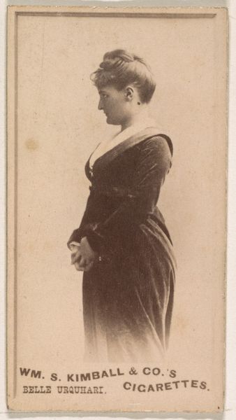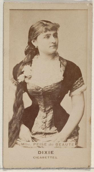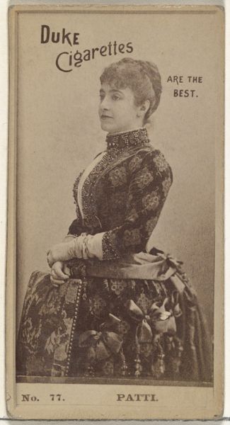 Editor: Here we have an albumen print, a photograph taken by Jeremiah Gurney between 1869 and 1874. It's a portrait of Euphrosyne Parepa-Rosa, the opera singer. The tones are lovely, warm sepia. She’s very formally posed and looks so serious! What do you see in this piece, beyond the surface? Curator: Ah, yes, a formal pose but caught just a hair’s breadth from… what? Smiling? Scowling? Perhaps a moment's reverie. Makes me wonder what music she was thinking of at that very moment. These photographic portraits, even in their formality, aimed to capture something essential about the sitter, you know? Gurney was a master of light, and it seems like he wanted to play with that reflective material of her dress to capture depth, form. It’s a far cry from a selfie, don’t you think? Editor: Definitely more considered than a selfie! The sheen of the dress is amazing – almost metallic. Do you think the rigid posing affected the perception of people back then? Curator: Oh, undoubtedly. There’s an aspirational quality; these images constructed identity as much as reflected it. Think of the theatricality of her profession juxtaposed with the nascent and rigid nature of photography at that time. Did that impact what the Victorians would think of "celebrity"? Editor: That makes a lot of sense. Seeing her through that lens, both literally and figuratively, really shifts my understanding. Curator: Mine too! I think that's the magic: artworks keep teaching us to listen, to wonder about that moment just *before* the click.
