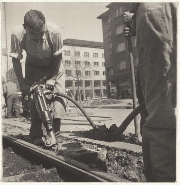 Editor: So, we have Robert Frank’s gelatin silver print, "Laborers--People," made sometime between 1941 and 1945. It’s a stark, black and white image of workers, looks like they are fixing or laying tracks. There's a real sense of...labor here, the toil. What catches your eye? Curator: The image's power rests in its straightforward portrayal of labor, characteristic of the Social Realism movement. Given the period, shaped by war and economic hardship, Frank’s work can be viewed as a commentary on the dignity, but also the dehumanizing aspects of physical work, particularly in public spaces. Note how the framing reduces the figures to shapes, almost anonymous. Do you get a sense of their individual stories? Editor: Not really, they blend into their tasks and surroundings. Is this anonymity intentional? Curator: Possibly. Social Realism aimed to depict everyday life, often focusing on the working class and the poor. By obscuring individual identity, the artist broadens the representation to an entire social group. The image, displayed in a gallery, participates in constructing an idea of ‘the worker.’ Consider too, who is absent – who decides which laborers and which activities are framed? Who is outside the frame? Editor: So, it’s not just showing work, it's commenting on who gets seen, and how? I hadn't thought of it that way. Curator: Exactly. The social and political contexts are vital. The power of art often lies not only in what is depicted but what is implied about society, power, and representation. Editor: This really gives me a new angle for seeing it. I will never look at photography the same way again. Thank you! Curator: My pleasure. Remembering that every image, even the seemingly most realistic one, involves choices, and reflects perspectives is a valuable takeaway.