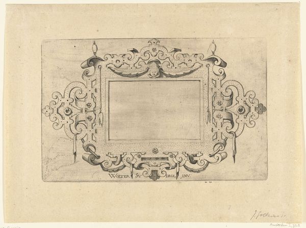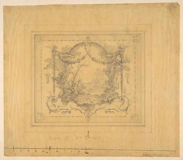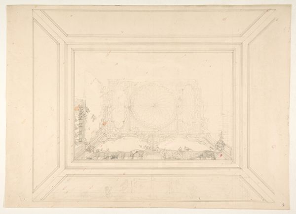 Curator: Here we have a 19th-century piece entitled "Design for Ceiling" by Charles Monblond. The media include drawing, print, pencil, and paper. Editor: It has a ghostly elegance, doesn’t it? That pale pencil on paper gives the design an ethereal, almost fleeting quality, like catching a dream. It also looks like it might be massive! Curator: The artist worked with pencil and etching to display decorative art with a classic academic style, and focused on geometric forms in his drawing and print making, offering a glimpse into 19th-century interior design and its relation to architectural processes. How would this design influence, for example, the labor of artisans to create a finished product on such a scale? What's the context of making luxury interiors at the time? Editor: Absolutely, context is key! I immediately look at the balance – or perhaps calculated imbalance – of the composition. Notice the elaborate corner flourishes versus the more open central space, and how the curvature of one side plays against the straight edges. The delicate pencil work creates almost a dance across the surface. I want to break it down using some structural analysis... what meaning lies in these shapes? Curator: Right, but I also consider how social class and the politics of wealth are inscribed in such ornament. This piece seems to point to larger economic structures that enabled such decoration; Who are the consumers, and how are their values reflected in the labor and material deployed? Editor: Agreed, it is vital to consider this artwork within a cultural, political, and historical context, but let's not overlook the visual narrative Monblond crafts. Consider the arrangement of classical motifs like acanthus leaves and cherubic figures. The composition evokes a sense of airy grace; yet it is tied to classical ideals through geometry. Curator: A tension I also perceive. This "design" implies a vast and expensive production, an exercise of class distinction through the art of architectural fabrication. To truly read it we must understand who it speaks for, as a manifestation of material consumption in that era. Editor: Ultimately, viewing this drawing, one must confront the artistry and the craftsmanship it anticipates; from pencil to product the shift shows its value as art object to reveal both tangible processes and more abstracted historical trends. Curator: Yes, by studying drawings such as Monblond’s ceiling design, we illuminate 19th-century aesthetic values and economic circumstances of elite material expression.