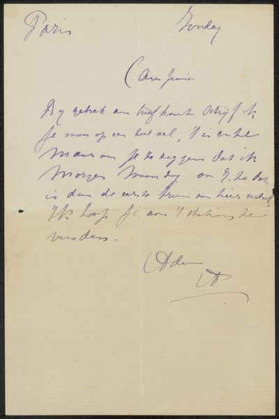 Adriaan Pit penned this letter to Philip Zilcken using paper and ink, everyday materials that facilitated communication in the late 19th and early 20th centuries. The material qualities of the letter are humble. The fibers of the paper, likely wood pulp, bear witness to the industrialization of communication. The ink, probably iron gall, has a fluid consistency, allowing for the graceful script characteristic of handwriting. This act of inscription, where the writer’s hand directly shapes the message, imbues the letter with a sense of intimacy. The act of writing itself is a skilled tradition, requiring years of practice to master the elegant cursive visible here. This contrasts with the mass-produced nature of the materials, reminding us of the changing social context in which personal correspondence occurred. The ease with which the letter could be created and transported belies the effort required to maintain meaningful connections. This challenges distinctions between ‘high’ art and the craft of daily life.