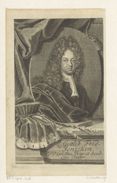 Curator: Looking at this intriguing image, we see a portrait identified as "Portret van Andreas Rüdinger," placing its creation sometime between 1703 and 1741. The portrait’s author is Gabriel Uhlich. Editor: My first impression is one of austerity, almost…spectral. The light is used in a stark manner, the thin hatching feels deliberate, economical even. What medium was used? Curator: It appears to be a pencil sketch on toned paper. The lines are indeed delicate, and the artist clearly relied on hatching and cross-hatching to achieve tonal depth. It feels representative of print-making techniques during the time. We see a highly constructed image intended to communicate intellectual rigor. Editor: I agree. Look at the details: the texture of the clothing, the heavy wig that signifies status. How interesting that this elaborate costume becomes, in effect, part of the material conditions of image making. The artist must account for the symbolic weight of these signifiers and the work involved to depict them properly. Curator: Absolutely. And consider the placement within an oval frame, almost like looking through a window—or a keyhole, perhaps suggesting hidden knowledge. Note also the inclusion of the inscription underneath the image; this reminds us of printed proclamations and public pronouncements. I'm especially intrigued by his gaze, a hint of superiority mingled with, maybe, resignation? The contrast makes you question what that symbolism represents. Editor: Perhaps a knowing acceptance of worldly falsities? Considering the printed phrase references "lies", it speaks to the performativity of identity and social presentation embedded within materiality itself. The textures, the constructed gaze – all become components that form this persona and all rely on physical artistry. Curator: Well observed. This analysis gives new depth to our understanding of not only Rüdinger, the philosopher and physician, but the societal frameworks influencing even the most seemingly straightforward portrait. Editor: Exactly. Considering the physical production expands our appreciation for the thought that was translated through material means. Curator: Thank you for highlighting that critical link!