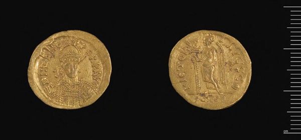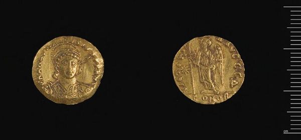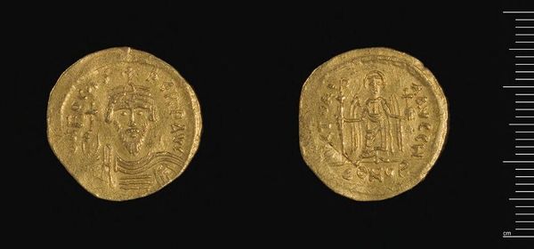 Curator: This tiny gold coin, attributed to Justinian I, weighs a mere 2.73 grams and resides here at the Harvard Art Museums. What is your first impression? Editor: It feels weighty, not in grams, but in history. Like holding a direct line to Byzantium, a tangible echo from so long ago. Curator: Indeed. Notice the intricate details, even on such a small scale. The iconography of power is striking; Justinian is presented as a strong, divine ruler. Editor: It's fascinating how potent those symbols were—a whole empire distilled into a coin, communicating legitimacy and authority. You almost feel the divine right radiating off it. Curator: Absolutely. And the material itself, gold, reinforces that message. It’s a symbol of wealth and enduring power, even now. Editor: It certainly holds its own, and gives you pause, doesn’t it? To think, those images, those symbols, still carry such meaning after all this time... Curator: Symbols echo through time, shaping our understanding. Food for thought from something so small. Editor: Precisely. A little universe right here in our hands.