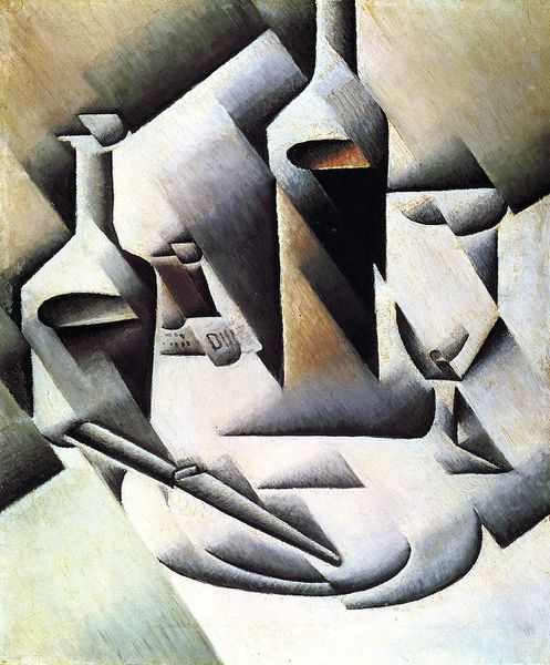 Curator: Before us we have Juan Gris’s “Still Life with Oil Lamp,” created in 1912. It is currently housed at the Kröller-Müller Museum in the Netherlands. Editor: Well, my initial impression is one of… coolness, perhaps? The subdued palette of grays, whites, and browns gives it a sort of intellectual detachment, despite depicting such mundane, everyday objects. It’s Cubism doing what Cubism does. Curator: Exactly. Gris, positioned within the Synthetic Cubist movement, was keen to collapse object and ground, disrupting our perception of material reality, of what labor or its instruments might look like. But beyond formal experimentation, there’s a broader social narrative at play. These were tumultuous years in Europe, just before the First World War. How do you see the connection here? Editor: The materials tell a story of production, right? Oil paint itself speaks to a growing industrial economy. Notice how he's flattened the space, almost negating any hierarchy between, say, the lamp, and the table it sits on. Are we looking at tools of labor being reconfigured and destabilized just as traditional labor was shifting and reorganizing? It certainly gives pause about whose hands these items are being touched and made by. Curator: Absolutely. Gris challenges the artifice of the bourgeois home—a disruption echoed by contemporary social movements challenging class structures, race, and colonial dominance at that time. Look closely; can you almost sense echoes of workers toiling to furnish spaces or their exclusion from leisure represented here? It prompts essential dialogues on art, commodity production, class disparity, gendered labor in households... Editor: What I appreciate is how he manipulates the surface with gradations of shadow to articulate a plane and mass which creates an actual, not simply depicted, material dimension to this domestic array. There’s so much more to Cubism than simply representation, even if that is fragmented and multiple. Curator: It's a striking example of how close attention to production methods in 1912 can expand to critical discussions surrounding politics, power, and subjectivity still essential for art interpretation now! Editor: It truly forces one to look and reconsider materiality that lies just beneath, in fact within, all paintings—be that brushwork or a reflection of social order.