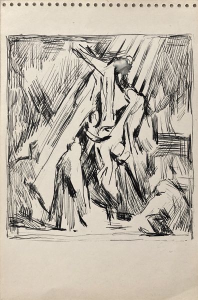 Editor: Here we have René Beeh’s 1921 pencil drawing, *Man Leading a Little Girl*. The raw sketchiness of the lines, coupled with the heavy shading around the man, gives the whole image a feeling of unease. How do you read the composition? Curator: Formally speaking, the stark contrast created through the use of varying pressures of graphite establishes a visual hierarchy. The densely marked areas command attention, drawing our eyes to the obscured face of the man and the stark branches looming behind them. Note the strategic use of negative space around the figures, intensifying the compressed, almost claustrophobic atmosphere. It’s an intriguing dichotomy. Editor: Yes, the space definitely adds to the feeling! Is that a tree, or some sort of structure, that seems to hem them in? Curator: The indeterminate form does contribute to the ambiguity of their surroundings. However, observe how Beeh manipulates the materiality of the pencil, using hatching and cross-hatching to delineate form and volume. This technique gives the figures a sculptural presence despite the drawing’s overall flatness. The formal interplay creates a powerful sense of psychological depth. Do you perceive a correlation between the man's downcast posture and the directionality of the pencil strokes? Editor: Definitely, there’s a downward pull created by those lines, and his posture amplifies that. I hadn’t considered that. I now appreciate the relationship between the pencil strokes and the emotion. Curator: Exactly. By dissecting the formal elements—line, tone, composition—we can decipher the symbolic language embedded within. It transcends mere representation to become a potent expression of something far more profound. Editor: This has really opened my eyes to the level of detail that goes into conveying emotion through simple marks. Curator: Indeed, it's a powerful demonstration of how formal decisions shape meaning.
