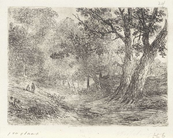 Editor: Here we have Paul Huet's "L'Ile Séguin in Flood," an etching from 1833. I'm really struck by the darkness and density of the trees – it's almost claustrophobic, and certainly not the pretty picturesque landscape I was expecting. How should we interpret this, in terms of what it might be saying? Curator: That initial reaction is spot-on. It disrupts traditional romanticism by acknowledging a darker side to nature, maybe even gesturing towards the idea of nature's indifference to humanity. Think about the social upheaval happening at the time. Does this piece perhaps reflect anxieties about industrialization encroaching upon the natural world, the flooding a symbolic erasure? Editor: That's fascinating. I hadn’t thought of the flooding as a potential symbol of industrialization. So, rather than celebrating nature, is Huet actually using it to comment on the instability of society? Curator: Precisely! And notice the level of detail given to the plantlife on the left compared to the distant and almost featureless water on the right. What statement is Huet making through these aesthetic decisions? The piece creates a dialogue, positioning the personal encounter with wild nature, full of complexity and texture, against the featureless landscape, devoid of detail. Perhaps he implies how easily nature will be made 'empty' if industry is permitted free reign? Editor: So, by emphasizing certain elements and downplaying others, Huet directs our attention to the cost of so-called progress and makes nature into a character with its own, perhaps fading, story. Curator: Exactly. And remembering that this is an etching – a medium accessible to a wider audience – underlines its potential to be a powerful piece of social commentary. It makes you consider how artists at the time were responding to pressing issues, using the landscape itself as a battleground. Editor: I'll definitely view landscape art with new eyes. Thanks so much!