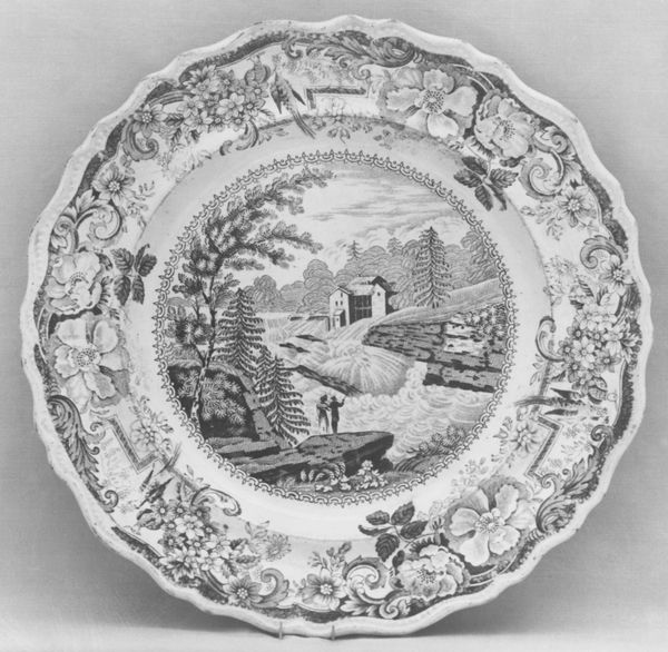Curator: Let's consider this 19th-century porcelain plate, one of a pair, produced by the Meissen Manufactory. It currently resides at the Metropolitan Museum of Art. Editor: The intricacy of the design is initially what grabs my attention—particularly the tender scene at its center, a man serenading a seated woman amid a softly rendered pastoral landscape. There’s a feeling of restrained yearning. Curator: Observe the plate's composition—a central genre scene, framed by detailed borders. The scalloped edge enhances the circular form. Each decorative element, from the floral motifs to the vignette inserts, plays with both positive and negative space. It is also quite a demonstration of ceramic virtuosity! Editor: Yes, the bordering is an echo chamber of symbols and motifs of luxury, recurring pastoral vignettes that point back towards idealized notions of courtly love and leisure. The figures in the smaller scenes along the border-- hunters, musicians—evoke romantic narratives beyond the central image. Curator: The use of monochrome imagery enhances the interplay between texture and surface, giving each element a delicate separation that highlights individual details but may also imply an intended hierarchy for the reading of the art object itself. Editor: In that regard, do you find it revealing about 19th-century social values or the patrons of Meissen at the time? The attention afforded these figures versus, say, images of laborers underscores very particular societal valuations. Curator: Certainly. Through a careful consideration of each element, this decorative plate operates on many formal and conceptual registers: it serves as object d'art, it engages the eye with its carefully considered composition and ornamentation, and ultimately tells a tale about its culture. Editor: Ultimately, I agree that the convergence of skill and the stories these pieces portray serves to broaden our cultural understanding, even through something as humble as a plate. A token and symbol all at once!