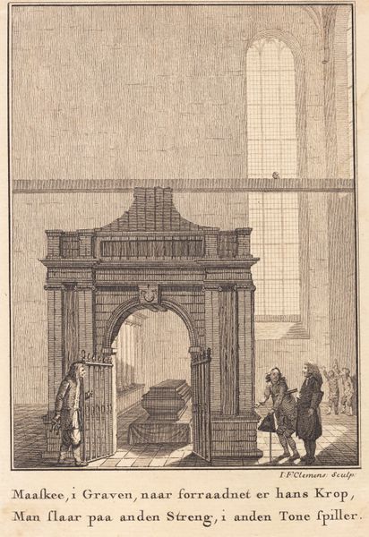 Curator: This engraving, "Den store Stad," which translates to "The Great City," was created by Oluf Olufsen Bagge in 1818. Editor: Immediately, I'm struck by its architectural severity. It feels imposing, almost theatrical. The archway, the flanking statues...it's a stage set, isn't it, hinting at grand civic dramas. Curator: Precisely. It reflects the Neoclassical ideals that were prominent at the time – a vision of order, reason, and a romanticized view of ancient Greece and Rome. Editor: And those tiny figures walking through...they feel so small, so insignificant, almost overwhelmed by the sheer scale of the architecture. Is that intentional, a commentary on the individual versus the state? Curator: It certainly can be interpreted that way. The artist seems to be exploring the individual’s place within the context of a rapidly changing urban environment. Remember that early 19th-century cities were centers of intense social and political ferment. This image may be hinting at the power structures inherent within city life. Editor: And yet, despite the overall austerity, there's something romantic, even whimsical, in the way the light falls on the scene and in the attention that the artist gave to the characters occupying this world. Curator: Absolutely. While technically precise as an engraving, it isn't a sterile record. It holds a unique mood through carefully modulated shades and the almost dream-like backdrop to the "great city". The inclusion of such figures adds a human element, softens the harshness. We can recognize our fellow human in it still, can't we? Editor: You're right. I started out thinking 'grandeur,' but I end seeing it as almost a story. I'd love to wander through it myself. Curator: That’s the enduring power of art, isn’t it? How it makes the abstract visceral.