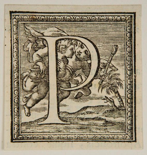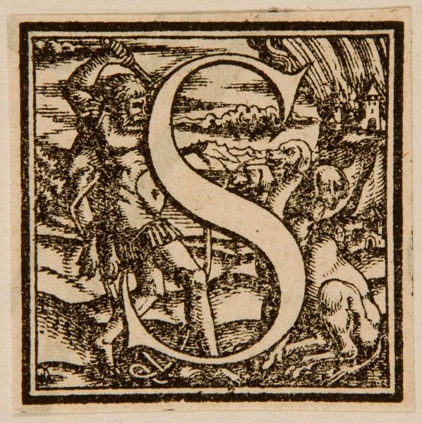 Editor: Here we have the block print "Letter R," author unknown. It's quite fascinating! The letter itself is intertwined with a horse, a man, and even what looks like a dragon. What strikes you about the composition? Curator: The interplay of line and form is compelling. Notice how the artist uses hatching and cross-hatching to create depth and texture. The letter R serves as both a structural element and a frame for the narrative scene. The linear quality is also notable; how do you interpret the spatial arrangement? Editor: It feels a bit crowded, almost chaotic, but the R provides a sense of order. I wonder if the artist was making a statement about the relationship between language and nature. Curator: Perhaps. Or it could simply be a decorative element, emphasizing the aesthetic qualities of the letterform. The balance and interplay are all part of a system that conveys meaning on more than just a literal level. I’ve not quite put my finger on it yet, what about you? Editor: I never thought about it that way! It's amazing how much can be conveyed through line and form alone. Curator: Indeed. The beauty of art lies in its ability to evoke multiple interpretations.