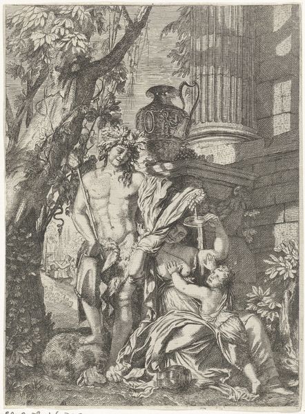 Editor: Here we have "Vrouw met gevleugeld hoofd toont bas-reliëf aan jonge man" by Louis Fabritius Dubourg, an engraving from 1720. The Rijksmuseum is home to it now. It looks… intensely theatrical. What's your read on this, looking at those dramatic figures? Curator: Oh, theatrical indeed! It's like stepping into a dream, isn't it? Look at that winged figure – is it a muse, a spirit of inspiration? And the young man, so engrossed in the bas-relief. The very act of creation is alive here, yet, tell me, do you see something satirical lurking beneath the surface? Editor: A little, actually. The expressions seem almost cartoonish at moments, a touch exaggerated. The miniature sculpture looks like he wants to join the conversation! Curator: Precisely! Dubourg is playing with high and low, isn't he? Referencing classical mythology, with the winged figure echoing Nike, perhaps, while poking fun at artistic pretension. Consider that little statue - pure comedic genius! He's whispering, "Don't take yourself too seriously!" Which begs the question, how does *this* print converse with contemporary tastes and debates about artistic license, perhaps? Editor: It does feel timeless, that push and pull between reverence and satire. I appreciate that playful wink in an otherwise serious scene. Curator: It’s a lovely reminder that art is best served with a good dollop of humor and humanity. These artists keep the conversation alive. The conversation within, most of all.