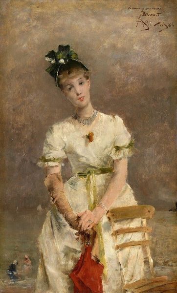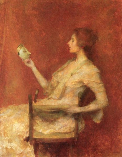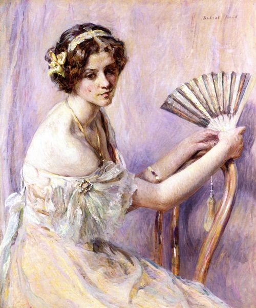 Editor: Here we have Thomas Wilmer Dewing’s “The Palm Leaf Fan” from 1906, painted in oil. It’s really captivating, especially the way the dress seems to melt into the background. What strikes you when you look at this? Curator: Well, considering the materials, I think we should really be looking at what Dewing is trying to *do* with oil paint here. Notice the almost equal importance given to the figure and the background, created through similar brushstrokes. This blurring challenges the traditional hierarchy in portraiture, doesn’t it? Editor: I hadn't thought about it that way. Curator: Right – instead of showcasing an individual's wealth or status as an individual, which was the established portrait tradition, Dewing spotlights the very *act* of painting. It's less about the woman and more about the materiality of the paint itself. Think about the availability of new pigments at this time, the evolving commercial art world and how this allows a focus on experimentation. Does that resonate with you? Editor: It does. I suppose I was drawn in by the colours and didn't think about how much the artist was exploring the qualities of the paint itself. Curator: Exactly. The impressionistic brushwork isn't just about capturing light; it’s about celebrating the inherent qualities of the oil. Even the so-called ‘subject’ – the woman – seems more like a vehicle for exploring color and texture. Editor: It's almost as if she's wearing the brushstrokes. Curator: Precisely! It questions the consumerism in art; it challenges how labor manifests in artwork. It asks you to ponder, is it the artist or material at the forefront? Editor: This makes me think about Impressionism in a totally different way now. Curator: Hopefully. By focusing on materiality, on the methods of production, we discover fresh meanings in even seemingly straightforward artworks.
