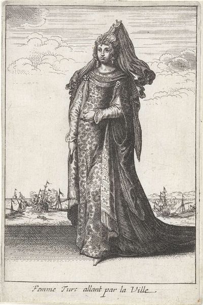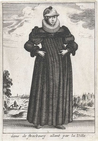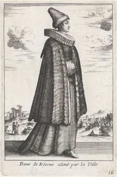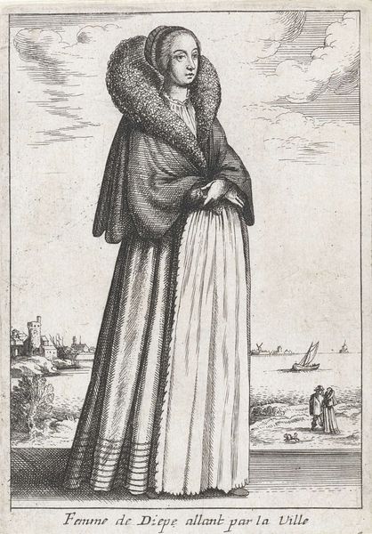 This print, "Femme de Vienne en austriche allant par la Ville," was made anonymously, offering us a glimpse into the attire of a woman in Vienna. Consider the layers of identity and status embedded in the woman’s dress. Her fur-lined cloak and the lace collar speak to a certain level of affluence, signaling her position within the city's social hierarchy. The choice of clothing also reveals something about the cultural norms and expectations placed upon women in this historical context, specifically concerning modesty and public presentation. How might her experience of moving through the city differ from those of other women, or men, of different social strata? The backdrop of Vienna itself adds another layer to the narrative. What stories do you imagine unfolding within those city walls? And how does this woman’s presence contribute to the city's ever-evolving story?