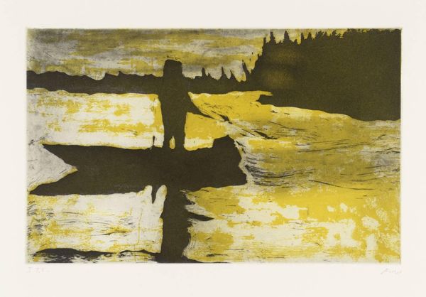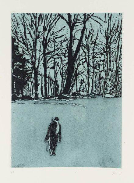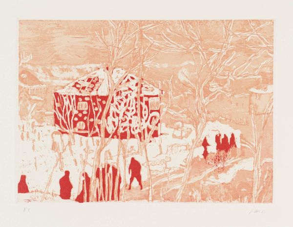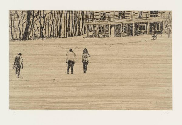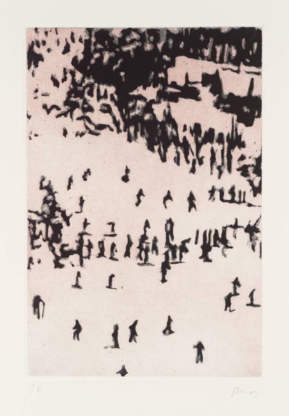 Curator: Today, we're looking at 'From Pond Life' by Peter Doig, an etching from the Tate Collections. It's a small work, just under 20 by 30 centimeters. Editor: It has a stark, ghostly quality. The figures look almost like apparitions in a snowy landscape. Curator: Doig’s work often explores themes of memory and the construction of place. His imagery, like here, invites reflection on how we perceive environments filtered through personal and cultural lenses. Editor: The etching technique creates a fascinating texture. You can really see the labor involved in making the marks, the intentionality in the gradations of tone, which adds to the mysterious mood. Curator: I agree. Doig’s images resonate precisely because they are both familiar and unsettling, questioning the role of imagery in shaping communal experiences. Editor: Considering the labor that goes into this, it makes you think about the value we assign to this type of work. Ultimately, it's about how we materialize our social imaginaries, isn't it? Curator: Absolutely. His pieces encourage us to reconsider the narratives around place. Editor: The dialogue between the craft and the social commentary is compelling.