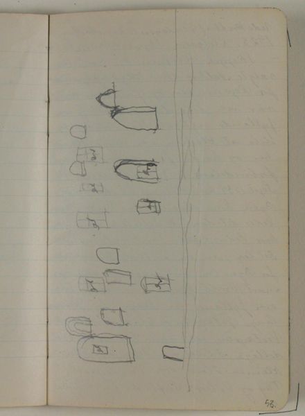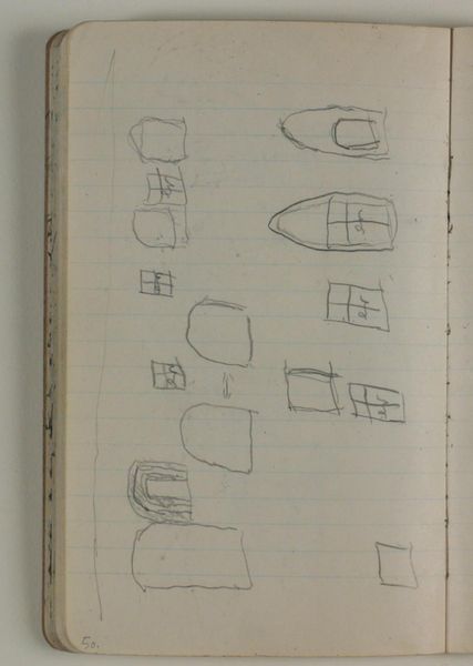 Editor: This is "Forskellige tegninger," or "Various Drawings," from 1933-1934, attributed to Anna Larsen Stevns, though that's tentative. It’s pencil on paper, and it looks like a page torn from a sketchbook, filled with geometric shapes. I am interested in this work, I’m trying to get my head around it. What do you see in this piece? Curator: I see an investigation of form driven by the available materials, paper and pencil. Notice the way the artist repeats and varies the shapes, almost as if testing the limits of the pencil and paper. It speaks to the accessibility of art making; that creation stems not from divine inspiration, but simple things like readily accessible tools and materials. How do you see that? Editor: So you're saying the focus isn’t so much on what the shapes represent, but on the act of drawing itself, and how limited materials can generate art. Is that a radical idea? Curator: In some ways, yes. For centuries, art history privileged the grand narrative and the artist’s genius. But a materialist approach draws our attention to the conditions of artistic production. It democratizes art by focusing on the labor and resources involved, challenging traditional distinctions between “high” art and everyday practice. Do the sketchbook and the shapes invite mass consumption, or solitary refinement? Editor: Well, since the sketchbook is available to all, it allows many to start doodling to come up with different shapes. The focus becomes that it's available to consume with an unlimited range of possibilities, and I feel a shift from thinking about this as someone else's precious work. Curator: Precisely. Seeing art this way encourages us to think critically about the systems that create and sustain art making, moving beyond individual expression to consider collective engagement with art and production. Editor: I’ve never thought of it like that before! The raw materials really change the meaning for me. Thanks for pointing out the artistic consumption, materiality, and democratization in this sketch.