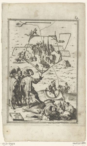 Editor: This engraving by Romeyn de Hooghe, made around 1672, is an illustration for Allain Manesson Mallet's 'Den Arbeid van Mars.' It depicts a star-shaped fortress. The sheer detail of the line work is impressive, but the symbolic structure hovering above the activity at the bottom of the image almost makes it seem like a dreamscape, not reality. What do you see in this piece? Curator: I'm struck by how this image uses geometry—the star fortress itself—as a symbol of power and control. It's more than just a city plan. The star, across cultures, often embodies aspiration, guidance, or destiny. But here, it’s a militarized destiny, looming, as you observed, over the daily lives of soldiers and planners below. Editor: So the star isn’t just decorative? Curator: No, not at all. The "star fort," in reality, represents the dawn of modern warfare, but in this artistic rendering, we also find this recurring aspiration to find order and control during conflict. Notice the individuals are arranged to gaze and admire this ordered shape and construction, which presents the star not just as protection but as a potent symbol of command. Does that begin to shift your thinking? Editor: It does. I was so focused on the precision, that I almost missed the symbolism in that very exactness! So what kind of memory or aspiration is evoked in this case? Curator: Perhaps it’s the enduring cultural hope that reason, embodied by geometry, can ultimately triumph over chaos, which warfare so readily represents. Even now, we see these fortresses influencing modern design—airports, for instance—always seeking that balance of efficiency and protection. The artist makes the case that war can create order... though the question remains, is that true? Editor: This really makes you think about the image differently. Thanks for sharing your knowledge! Curator: And thank you. Spotting those subtle recurrences is always a delightful way to learn.