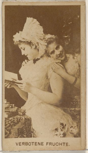 Curator: It has the sepia charm of a bygone era. Almost dreamlike, really. Editor: It certainly does. Here we have "Verbotene Fruchte," or "Forbidden Fruits," a photographic print dating from the 1890s, part of the "Actors and Actresses" series by W. Duke, Sons & Co., famed for their cigarette cards. You can find this little gem at the Metropolitan Museum of Art. Curator: Cigarette cards... fascinating! It’s like a tiny stage for Victorian values. One woman reading, the other draped languidly... is it intimacy, or a staged tableau? Editor: Well, think about it: the 'forbidden fruit' motif ties back to Eve and the apple. Here, we see a possible "forbidden" closeness, perhaps suggesting hidden desires or affections, all coded within this little commercial card. The act of reading, particularly the sentimental literature popular at the time, was ripe for projecting romance onto relationships. Curator: It really is a carefully curated narrative, isn’t it? Those dramatic shadows... very 'genre-painting' meeting early photographic portraiture. It's like a miniature soap opera packed into a rectangle, whispering stories of societal expectations and hidden desires. I see a complex story bubbling beneath that delicate surface. It seems almost defiant, doesn't it? To put it so subtly, right under the nose of, dare I say, the patriarchy? Editor: Absolutely. Even the women themselves are archetypes. The thoughtful introvert, perhaps a bluestocking, contrasted with the relaxed confidante, the one initiating the physical contact, blurring friendship with something deeper. It challenges norms even as it presents a picture of accepted domesticity, ripe for psychological decoding. Curator: And so many cultural assumptions resting in this "portrait". It reminds me to really see beyond my 21st century mind, which is constantly searching for irony. So in closing, I think that little card packs a profound emotional punch; it makes me reflect on the different layers and possibilities in one simple gesture. Editor: Exactly. A little window into shifting societal mores, anxieties and perhaps secret delights of the late 19th century. Small in size, large in suggestive meaning.