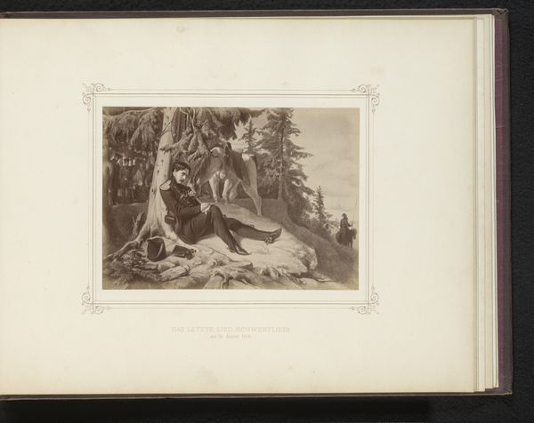 Editor: Here we have a reproduction of a drawing by Franz Mattig, predating 1859, titled *Fotoreproductie van een tekening, voorstellende Cupido met een leeuwin*, which translates to "Photographic reproduction of a drawing, representing Cupid with a lioness". The use of etching and print gives the image an antique feel. The tonal range of the grey shades creates a somewhat somber mood despite the cherubic subject matter. What strikes you about this print? Curator: I'm immediately drawn to the juxtaposition of the figures. Note how Mattig contrasts the soft, rounded form of Cupid with the more angular and powerful physique of the lioness. Observe the compositional tension created by placing these figures so close together, yet separated by their inherent natures. Editor: I see what you mean. There's a real sense of opposition and balance. But I wonder, how does the landscape contribute to this relationship? Curator: Precisely. The classical-realist landscape serves as a stage. Note how the trees frame the interaction, drawing our eyes to the two figures. The subtle tonal variations in the background create depth and enhance the dimensionality of the foreground elements. The carefully arranged composition compels viewers to reconcile the paradoxical figures in order to come to a better understanding. Do you also see a slightly diagonal organisation of elements on the two sides of the scene? Editor: I do now. I initially found it hard to pin down, but now I see how everything fits together into that subtle diagonal across the centre. So, would you say the power of this work lies in its formal arrangement? Curator: Indeed. It's the interplay of form and composition that generates the print's effect, encouraging reflection on contrasting elements unified into a single composition. It is only through sustained visual investigation of each individual aspect of the print and their mutual dependencies that we begin to approach its truth. Editor: That’s a great insight. Thank you. It’s really made me appreciate the image in a new light. Curator: My pleasure. Close visual analysis is the surest path to better understanding any piece of art.