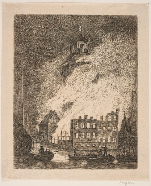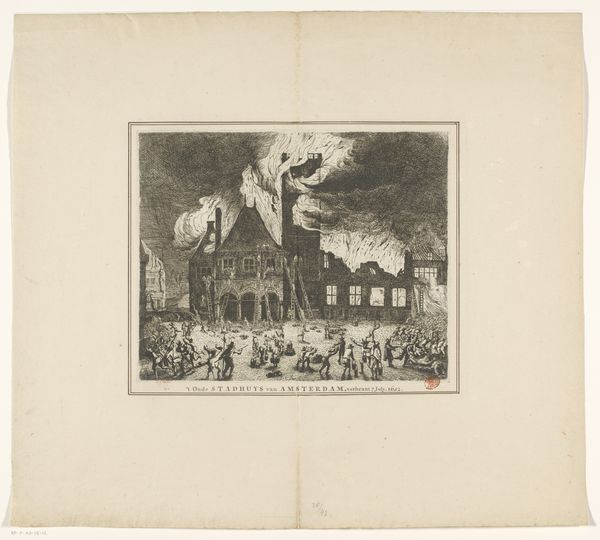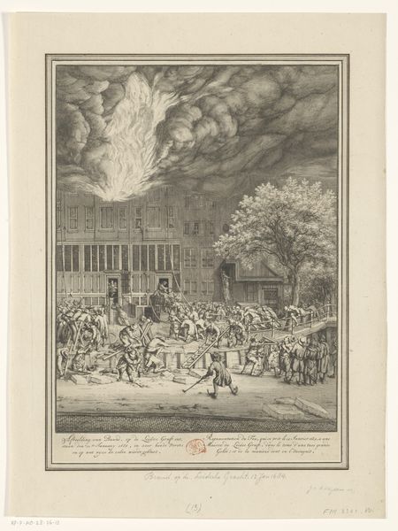 Curator: This engraving, titled "Brand aan de Visbrug te Leiden, 1766," captures a dramatic fire in the city. It was created by Noach van der Meer II, using ink on paper. Editor: Wow, immediate intensity. The swirling smoke dominates the image; it almost feels like it's swallowing the architecture. It’s incredibly dynamic for what I assume is a static print. There’s a real sense of chaos. Curator: Absolutely. Cityscapes during the Baroque period, such as this one, often depicted dramatic events as a way to capture a moment of change or upheaval, sometimes even to highlight the frailty of human creations against the power of nature or fate. Fire was especially potent – a destructive force, but also symbolic of purification and transformation. Editor: I see figures in the foreground. It gives a peculiar sense of perspective, almost like observers in a theater watching this catastrophe unfold. What does the fire symbolize for them? Curator: It would likely have held varied meanings for contemporaries. For some, a devastating loss, for others perhaps, opportunity – the chance to rebuild, or even profit. Also the response itself might represent societal order or its collapse. These townspeople, bearing water buckets, create a compelling dichotomy between destruction and collective action. Editor: There is such detail embedded in every mark. How did this type of image circulate? Curator: Prints such as these were vital forms of mass communication, acting as early forms of photojournalism in a time long before photography. It spread both information, in the form of these current events, as well as Baroque ideas, like using dramatic lighting to create an arresting composition, or emphasizing the grandeur of specific location to establish place-based identities and memories. Editor: It’s humbling to consider how people experienced such dramatic news at the time. It wasn't instantaneous, yet their reactions must have been very similar, a mix of fear, compassion, and perhaps, a strange fascination with spectacle. Curator: Precisely. This image becomes a cultural record. The individual terror merges into a collective memory. Editor: Makes you think about our own visual consumption, how many fleeting images cross our screens daily, versus this kind of impactful piece. Curator: An excellent point – this forces us to consider how events shape our memories, both individual and shared, whether by destruction or renewal.