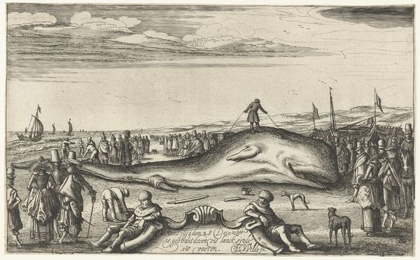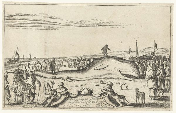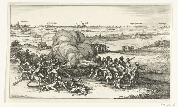 Curator: Here we have an engraving dating from 1649 to 1651, attributed to an anonymous artist. The piece depicts the Battle of the Downs in impressive detail. Editor: My goodness, it’s… chaotic! You can practically smell the gunpowder and brine just looking at it. There's this smoldering shipwreck in the foreground that anchors the drama. What is most immediately striking is how densely packed all the ships are. It makes the battle feel intensely claustrophobic. Curator: Precisely. The density serves to emphasize the strategic importance of the battle. Structurally, the print uses a high vantage point and meticulous detail to communicate not just the scale but the intensity of the naval engagement. Note the carefully rendered topography in the distance. Editor: The topography reminds me that war, as grand and symbolic as we make it, still happens in real places that have history beyond the theatre of the battlefield. But all those ships! A swarming dance of destruction. What story were the image makers trying to construct with all of those ship silhouettes? Curator: The formal composition, with its receding layers, suggests an inexorable momentum. Consider, too, the inclusion of text—a textual dimension integrated with the visual— situating the depicted battle within a larger narrative of Dutch maritime power. Note "CHIEN 8 RTEN TROMP". Editor: I do wonder about Tromp, you know? It's odd to see this triumphant scene of battle memorialized so long after the battle was fought. What do you think this suggests about its intention and meaning? Curator: The temporal remove underscores the engraving's propagandistic function, transforming an historical event into a timeless symbol of Dutch naval prowess. It elevates history to myth. The detailed execution also makes it a valuable document. Editor: Right, a myth, frozen in this monochrome medium... but still alive somehow with the echoes of cannon fire and desperate cries. Quite something. Curator: Indeed. A confluence of artistry and historical documentation.