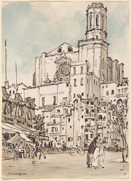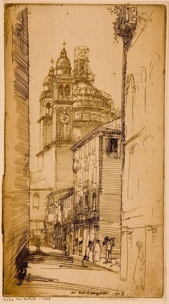 Editor: This is "Sevilla - Church of the Magdalena," an etching by Ernest D. Roth, from 1923. It reminds me of old architectural renderings, with delicate lines and a hazy, nostalgic atmosphere. What strikes you most about this piece? Curator: The etching exemplifies the enduring allure of the "picturesque" in early 20th-century art. Consider the institutional forces at play: Roth, an American artist, traveled to Europe, drawn by the well-trodden path of artists seeking Old World inspiration. His choice to depict a church is no accident. How does it relate to earlier travel sketches intended for the European Grand Tour market? Editor: You're saying that it's part of a larger historical trend? The quest for that postcard view? Curator: Precisely. The market for these images relied on romantic ideas of Europe. And consider the medium: etching, a printmaking technique that lent itself to mass production and circulation. Think about who his audience was. Editor: People who might have visited Spain, or perhaps dreamed of it? Curator: Exactly. And think about how that impacts Roth’s artistic choices. He uses a very traditional technique and compositional style to appeal to this audience, reaffirming specific cultural values and reinforcing expectations around travel and art consumption. Can you see the influence of earlier etchings or engravings? Editor: I think I see what you mean about his market and cultural references now, since the composition really sells this romantic version of Seville... the age of the paper definitely adds to that feeling too. Thanks, I will have to reconsider this artist and other views with the cultural context you've shared! Curator: You’re welcome! Now, go forward with your analysis. What similar things do you find about contemporary artwork about travel?